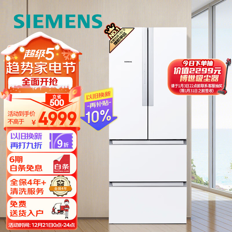 西门子(SIEMENS) 484升 变频混冷多门四门大容量家用冰箱 精细分类 白色 以旧换新BCD-484W(KM48EA20TI)价格:5499.00元!