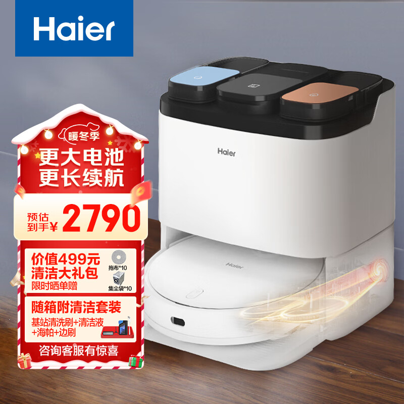 海尔Haier小金刚扫地机器人 扫拖一体自清洁自动集尘 免洗拖布拖地机吸 电解水杀菌热风烘干H11 MAX价格:3290.00元!