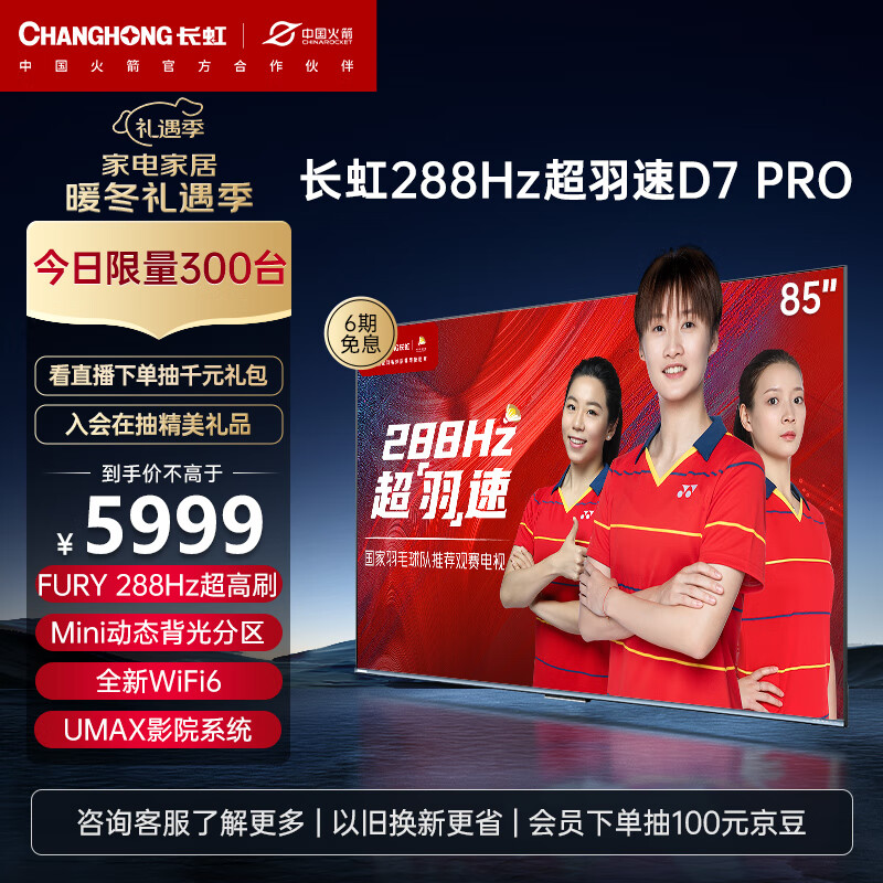 长虹电视85D7 PRO 85英寸288Hz游戏电视 Mini动态背光 高色域 MEMC 4K智能平板液晶LED电视机以旧换新价格:5999.00元!
