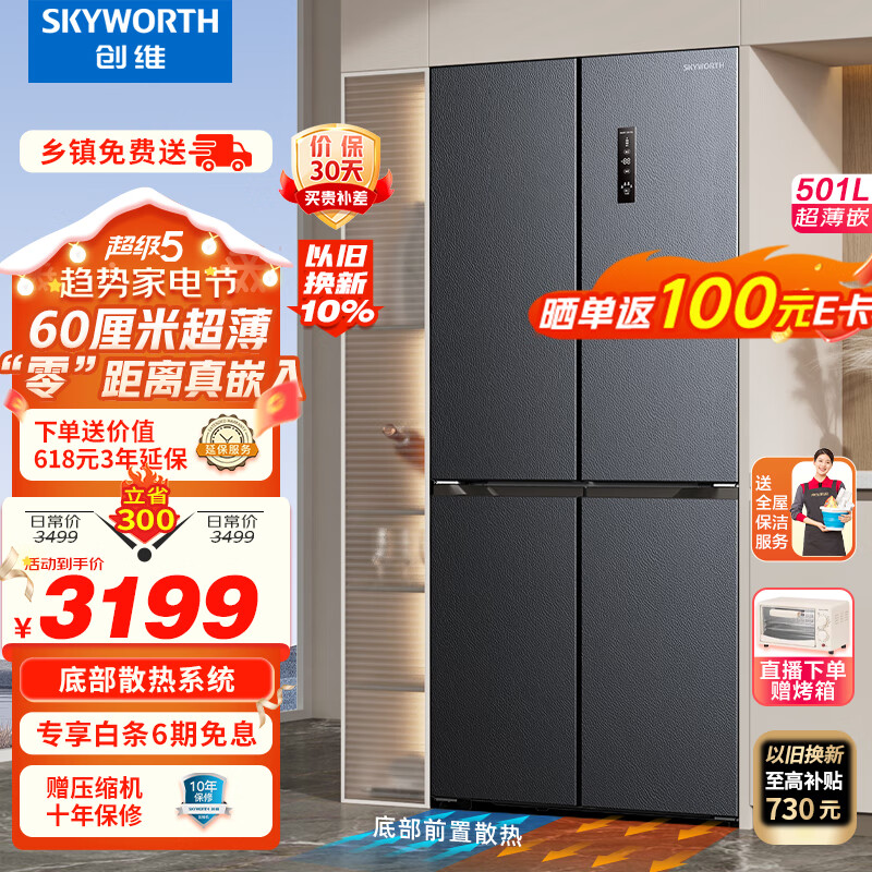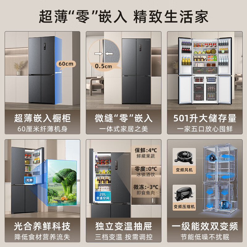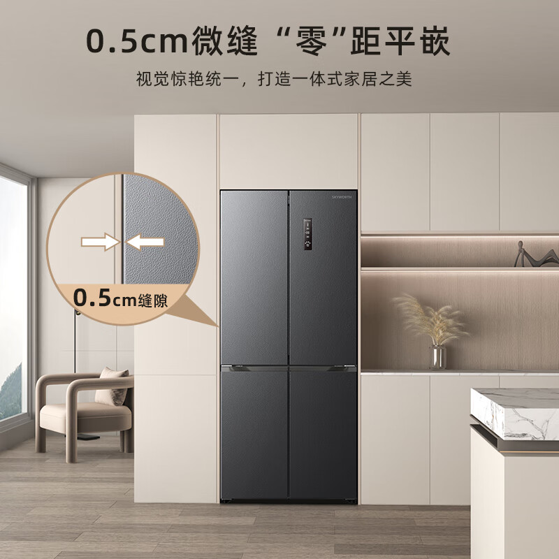 创维零嵌系列501升十字四开门冰箱60cm超薄嵌入式大容量家用冰箱一级变频底部散热BCD-501W4QB1哥窑灰价格:3499.00元!