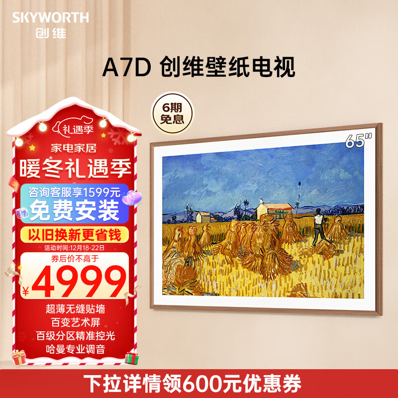 创维壁纸电视65A7D 65英寸 超薄壁画艺术电视机 无缝贴墙百变艺术屏 4K超高清护眼液晶电视价格:5599.00元!