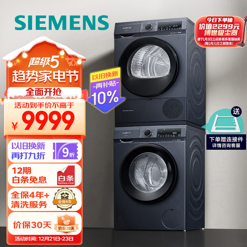 西门子(SIEMENS)湖蕴蓝洗烘套装 10kg智能除渍洗衣机+9kg热泵烘干机家用防缠绕 WG52A1X14W+WQ45A2D10W价格:11099.00元!