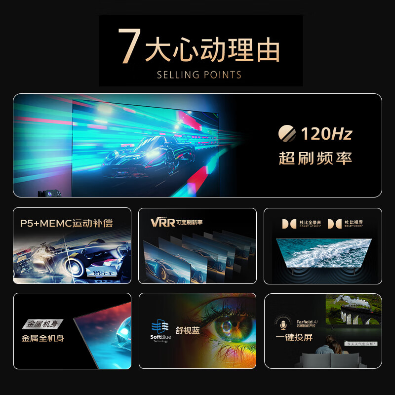 2、外形外观:大气上档次屏幕音效:画面清晰,后面还有两个跟低音炮似的,音效很棒。尺寸大小:非常好的一个电视,屏幕大,价格满意安装同步:安装人员态度很好,安装速度快总体非常满意,物有所值,家人们很喜欢。