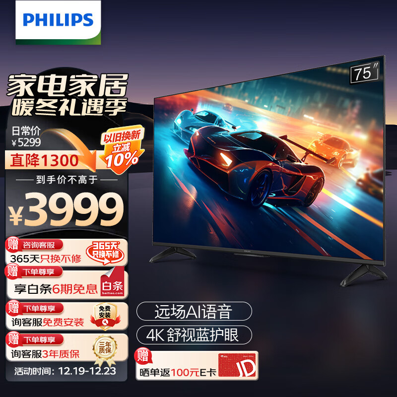 飞利浦(PHILIPS)75英寸4K超高清 护眼舒视蓝 MEMC智慧屏 远场AI语音 杜比全景 智能液晶平板电视75PUF7808/T3价格:3999.00元!