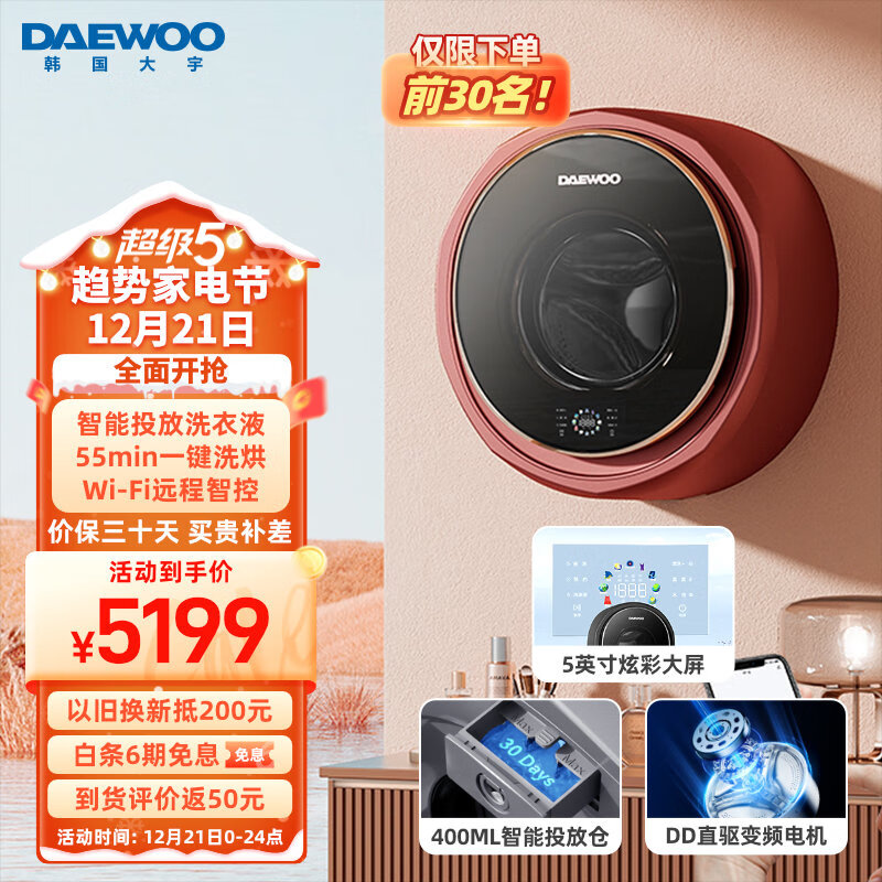 大宇(DAEWOO)壁挂洗衣机 洗烘一体 全自动变频3KG 彩屏WiFi智联 高温消毒 星云系列 DY-BGX07H 赤焰红价格:5199.00元!