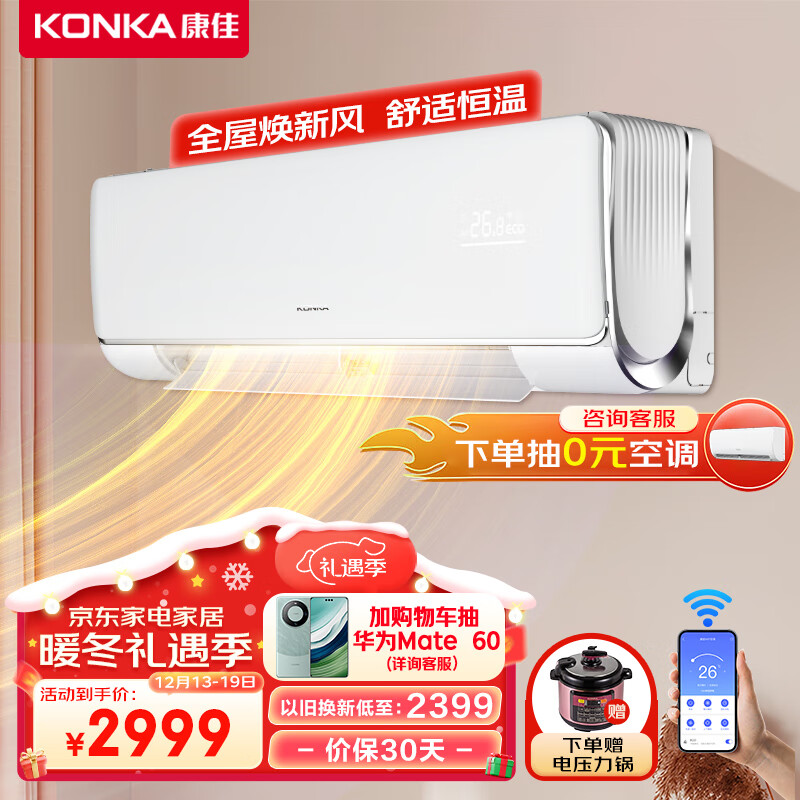 康佳(KONKA)【新风空调】 1.5匹 新一级 智能 40m3新风量 变频冷暖 以旧换新 卧室空调挂机 KFR-35GW/NAXF1价格:2999.00元!