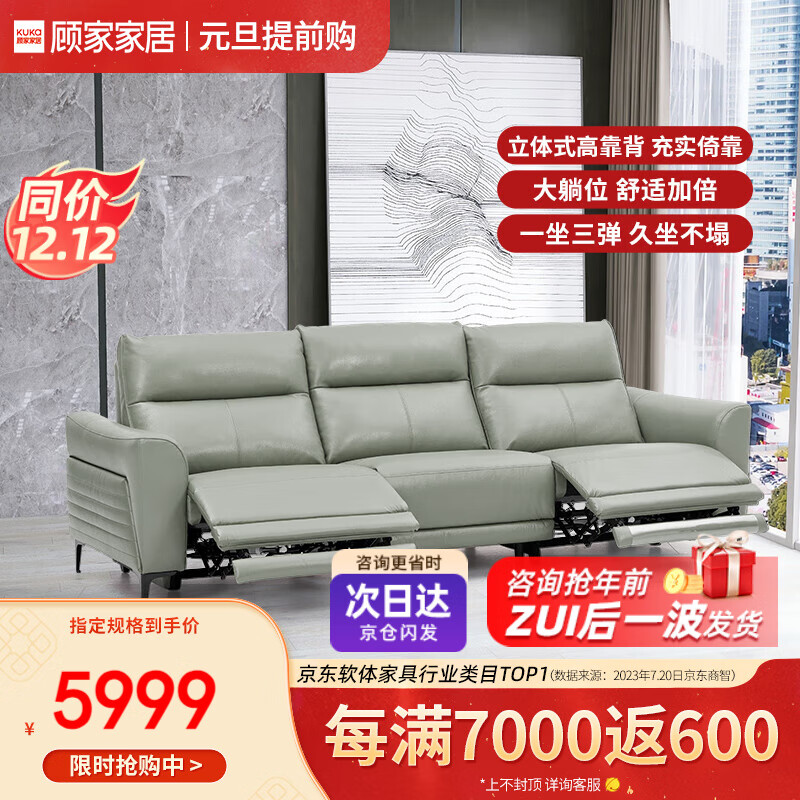 顾家家居(KUKA)头层牛皮沙发现代金属高脚功能沙发小户型6055绿3双2电动价格:5999.00元!