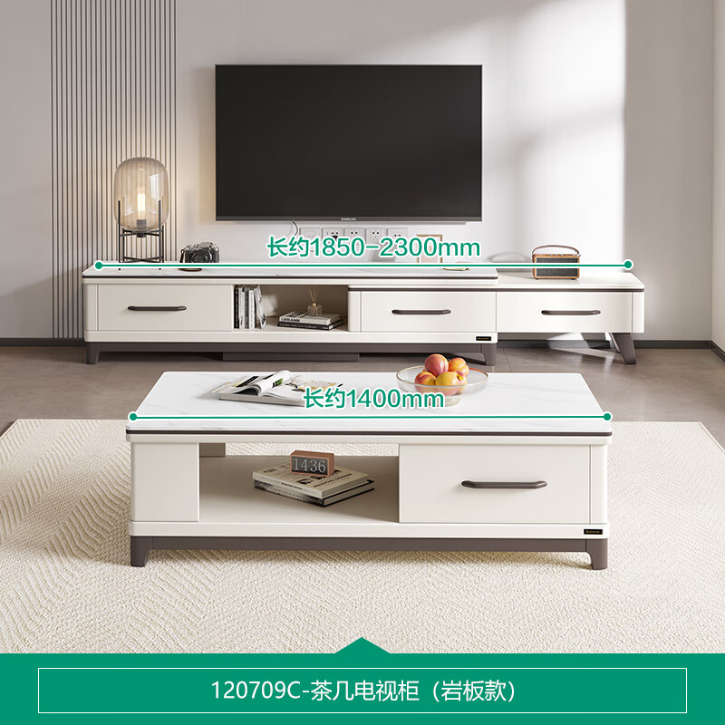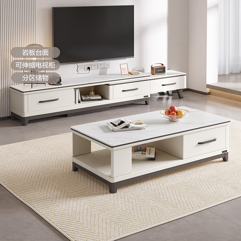 4、电视柜是可以伸缩的,可以根据客厅大小自由调节长度,拉出来储物空间就更多了,岩板台面,茶几也是双向抽屉,整体来说很不错