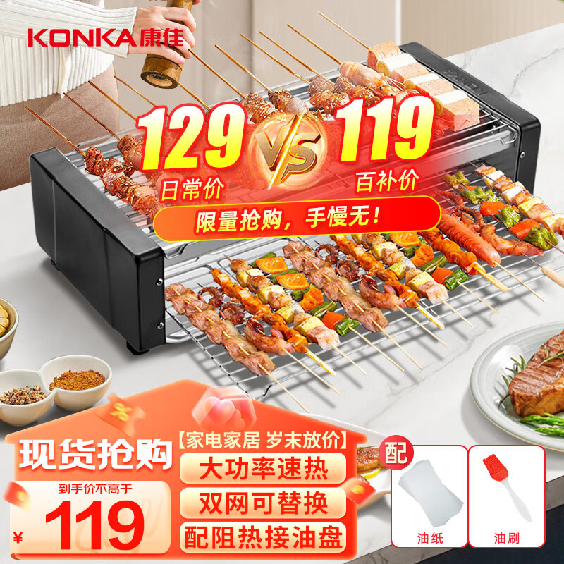 康佳(KONKA)电烧烤炉 烤肉机 家用无烟电烤盘不粘电烤炉铁板烧烤串机烧烤炉 双层烧烤架 KEG-W261C价格:119.00元!