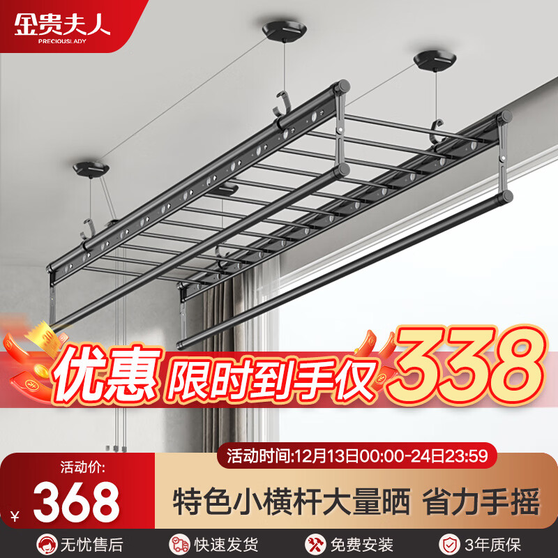 金贵夫人升降晾衣架阳台手摇晾衣杆四杆室内折叠晒衣架凉 2米+12根横杆价格:448.00元!
