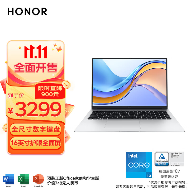 荣耀笔记本电脑全新MagicBook X 16 2022 12代酷睿i5 16+512 16英寸高性能轻薄本 长续航60Wh大电池 银价格:3299.00元!