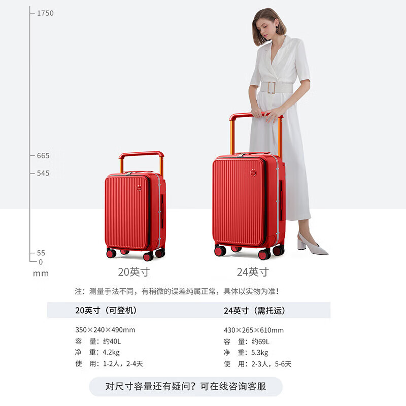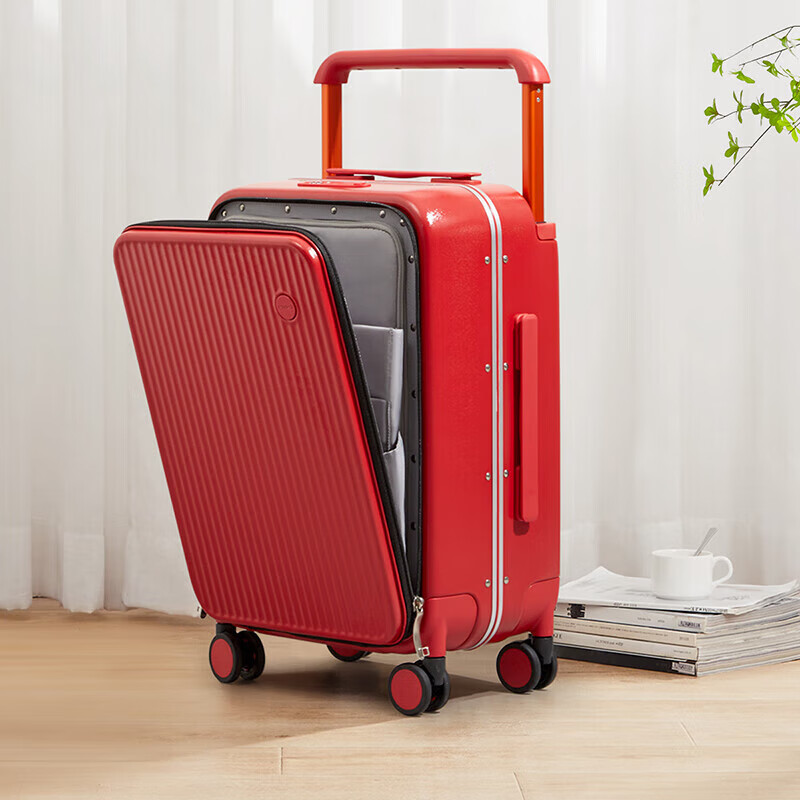 米熙前开盖条纹铝框拉杆箱子行李箱大容量托运旅行箱男女24吋复古红77价格:799.00元!