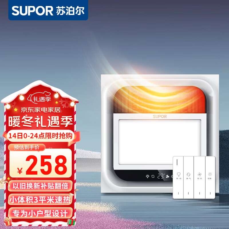 2、家里正在装修,共有三个卫生间,所以一口气选购了三个风暖浴霸,分属于不同品牌,这一款是苏泊尔的小尺寸浴霸,说是灯暖浴霸的替代款式,因三楼楼层偏低,所以准备用在三楼,目前尚在安装等待中。