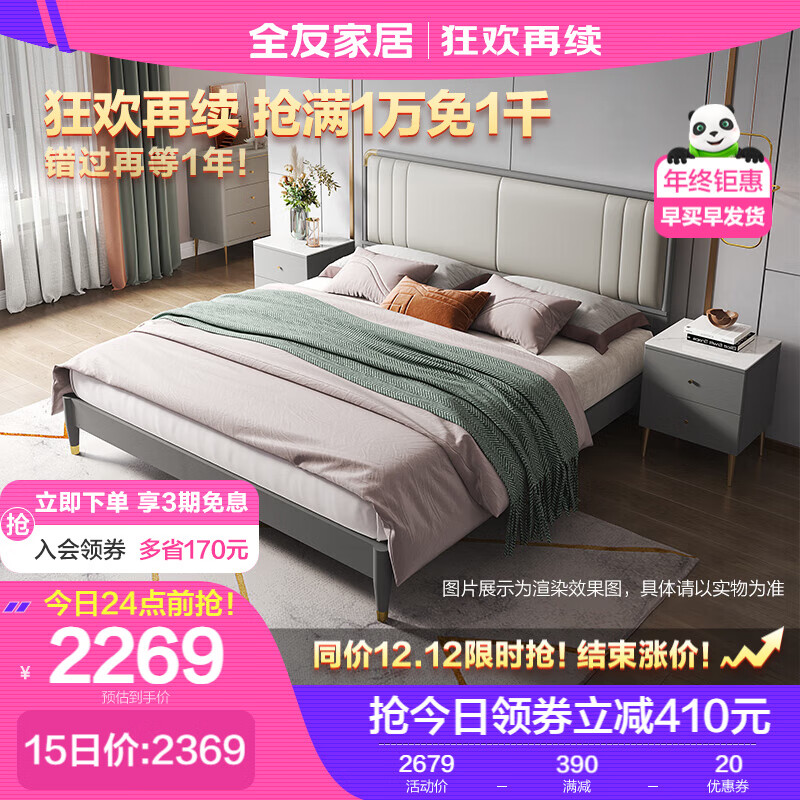 全友家居 床现代轻奢卧室双人床 实木框架带软包床屏框架床126901A价格:2679.00元!