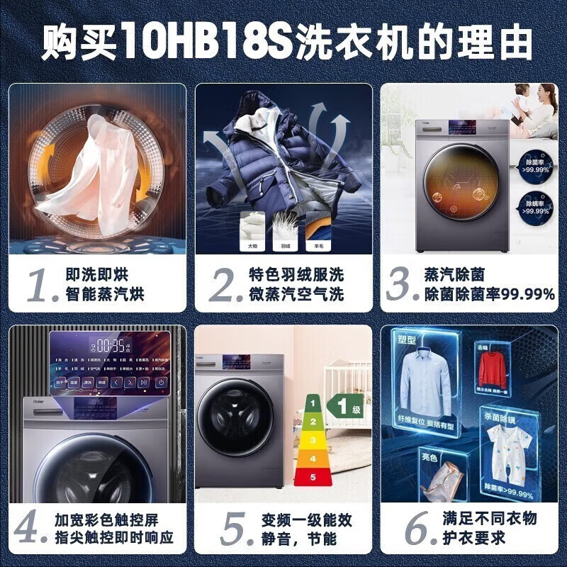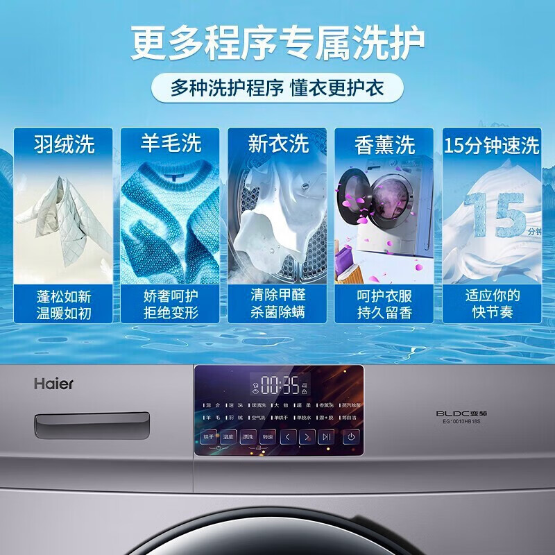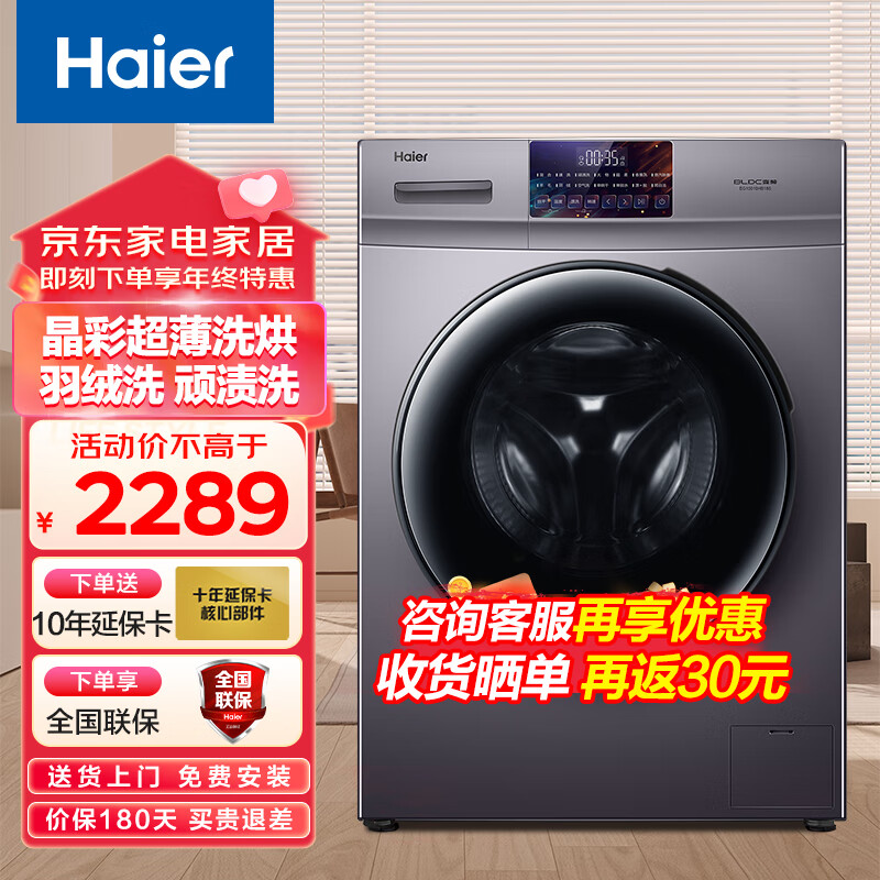 海尔(Haier)全自动洗衣机滚筒洗烘一体机10公斤大容量家用超薄晶彩屏蒸汽除菌螨智能烘干空气洗HB18S[家电]价格:2499.00元!