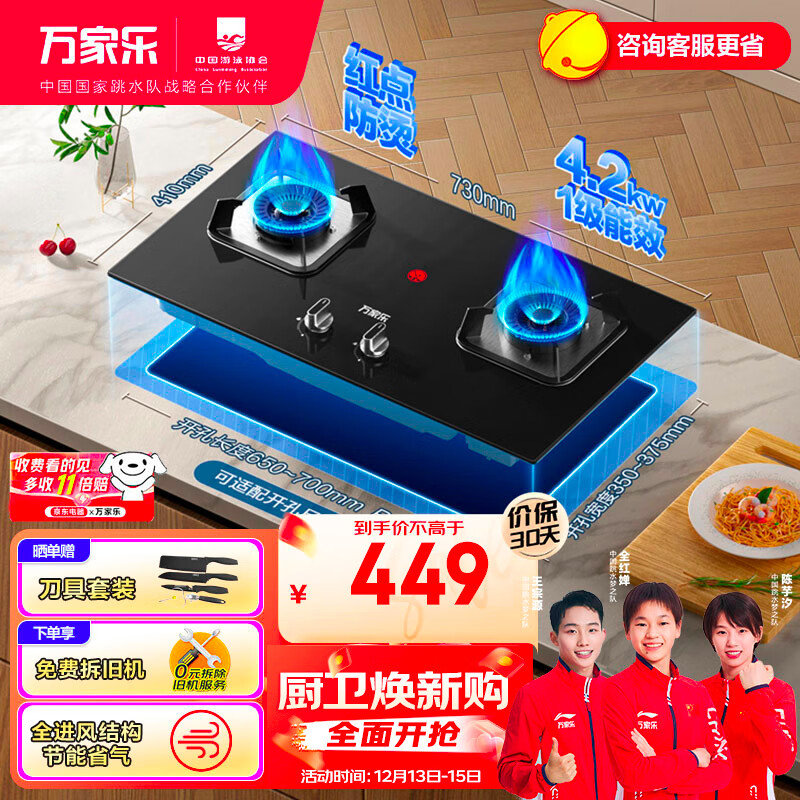 万家乐燃气灶 嵌入式台嵌两用 4.2kW煤气灶双灶 一级能效 高温防烫提醒 家用燃气灶具JZY-KA032B液化气价格:542.00元!