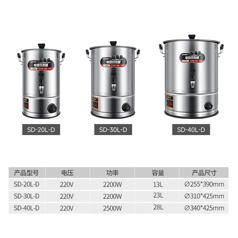 下面笔者为大家介绍三鼎SD开水桶的网友有不少,这回就给大家介绍一下,这个新出来的,很受欢迎,加热挺快的,买的小了,感觉实际的容积不到30升。优点加热快,可以连续沸腾或者保温。缺点会粘锅,锅底用几次就黑黑的了。快递快。
