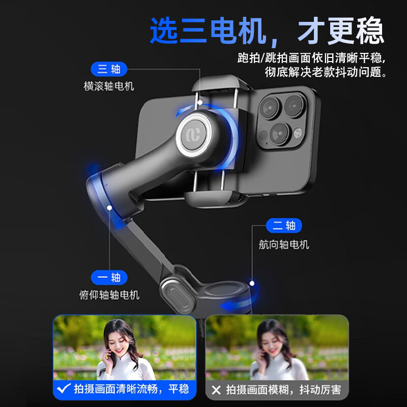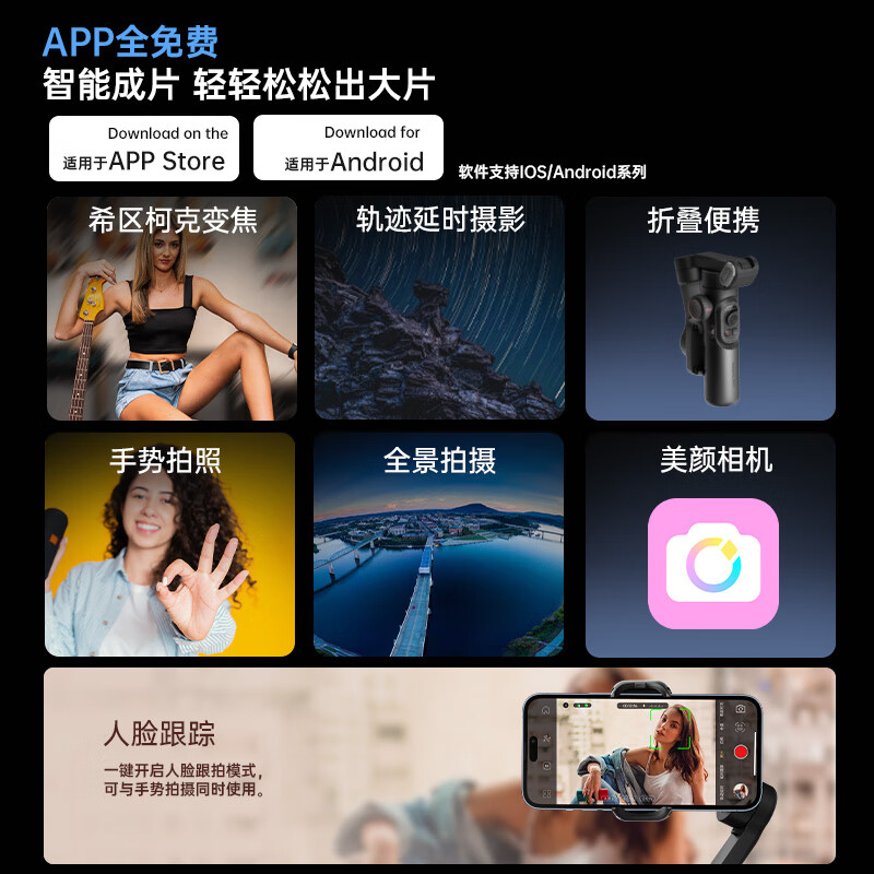 特征特质:模板拍摄,支持原生相机,简易调平,专业防抖,智能追踪,手势遥控,一键横竖屏,动态延时,超长续航