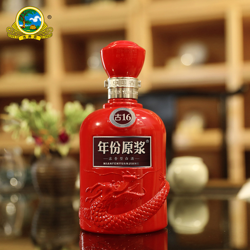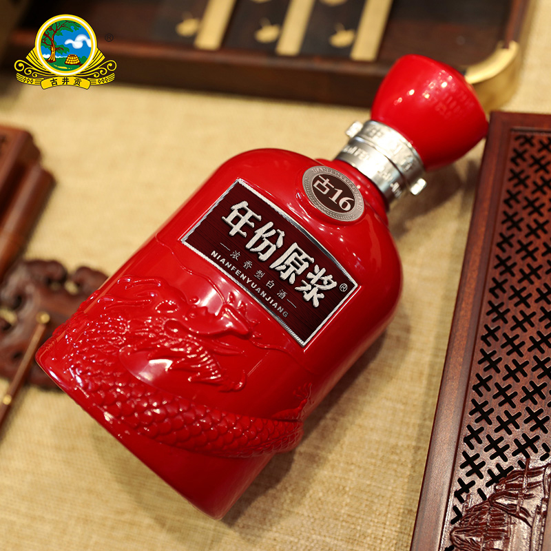 1、古井贡酒年份原浆16年,红色包装,很喜庆,也非常大气,而且皮质感,摸着很高级的感觉,适合节日礼品和自饮。