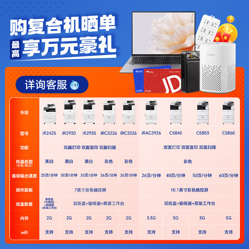 佳能(CANON)iR-ADV C5840 A3高速彩色激光数码复合机(双面打印双面复印双面扫描wifi 双纸盒+ 原装工作台价格:69999.00元!