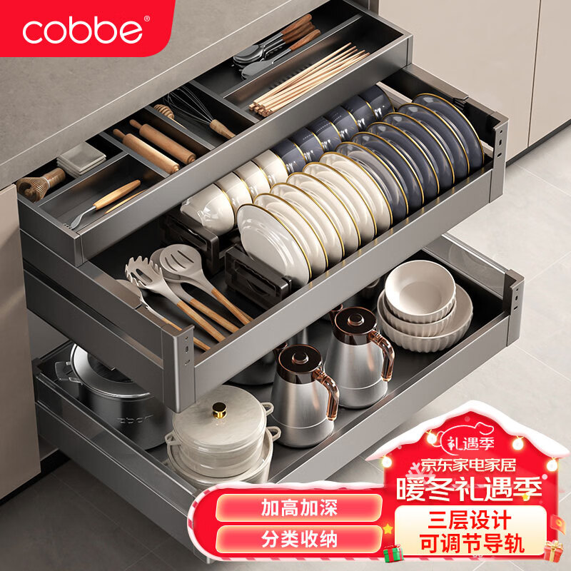 卡贝(cobbe)枪灰厨房拉篮橱柜抽屉式双层碗篮304不锈钢碗碟架置物架加深拉篮价格:1008.00元!