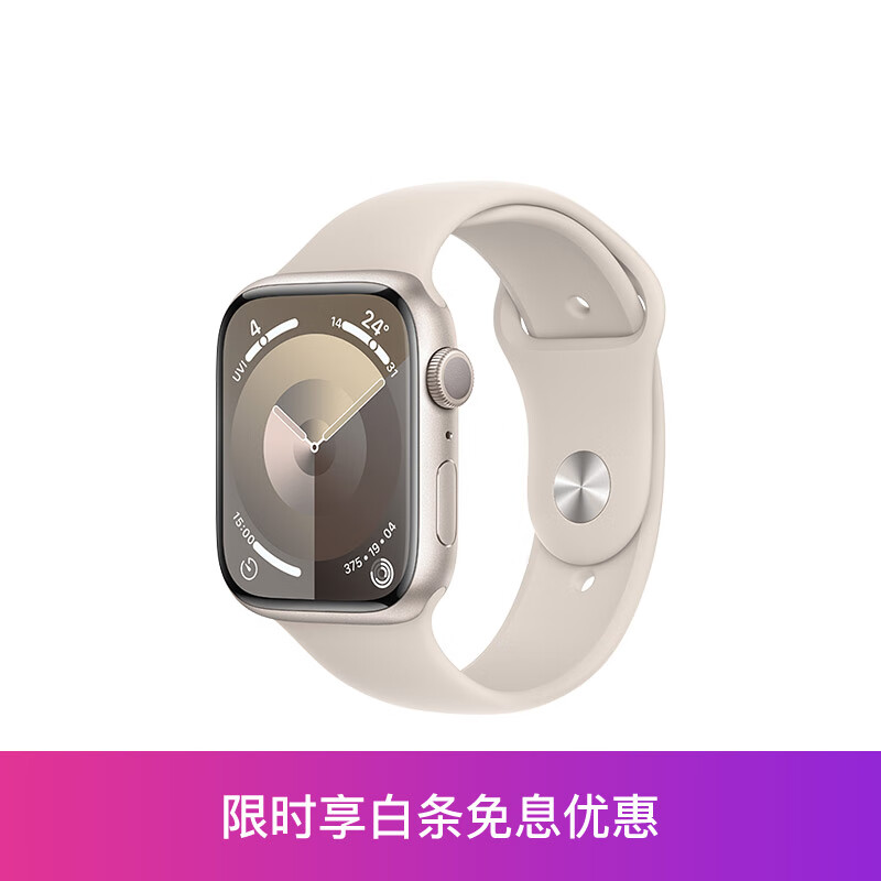 Apple Watch Series 9 智能手表GPS款45毫米星光色铝金属表壳 星光色运动型表带M/L S9 MR973CH/A【免息版】价格:3199.00元!