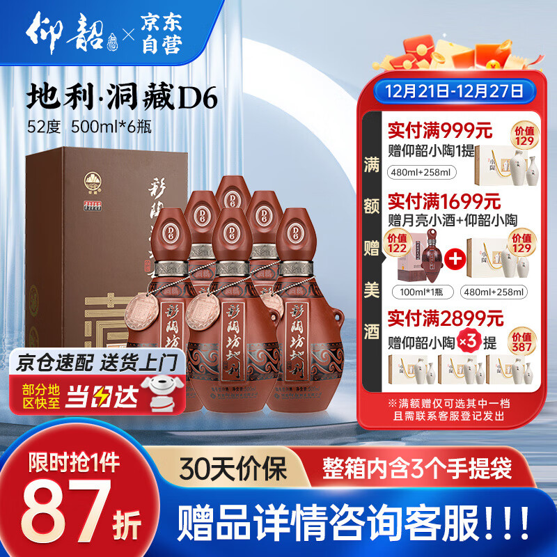 仰韶彩陶坊 地利洞藏D6 白酒 52度 500ml*6瓶 整箱装 九粮酒送礼宴请价格:1646.00元!