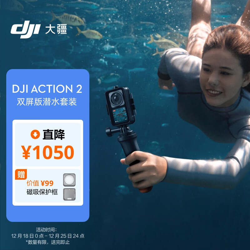 大疆 DJI Action 2 双屏版潜水套装 Osmo灵眸运动相机 水下摄影机 防水小型手持vlog相机+随心换2年版实体卡价格:3340.90元!