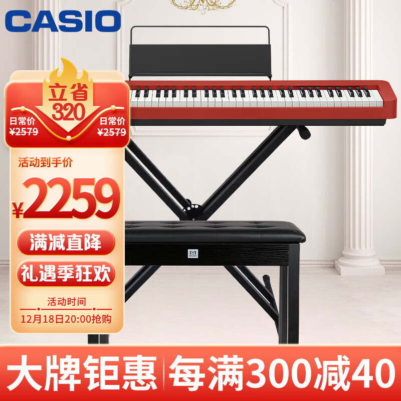 卡西欧(CASIO)电钢琴EPS130红色电子数码钢琴88键重锤初学红色单机+便携架+礼包价格:2579.00元!
