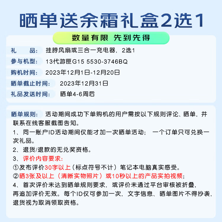 4、一直在京东购买电子产品,物流相当给力,头一天晚上下单,第二天上午就收到货!新游匣G15,英特尔13代酷睿性能出众,搭载4060显卡,配合上2.5K240HZ超高刷新屏,拥有超流畅的游戏体验。后续使用后情况在发吧