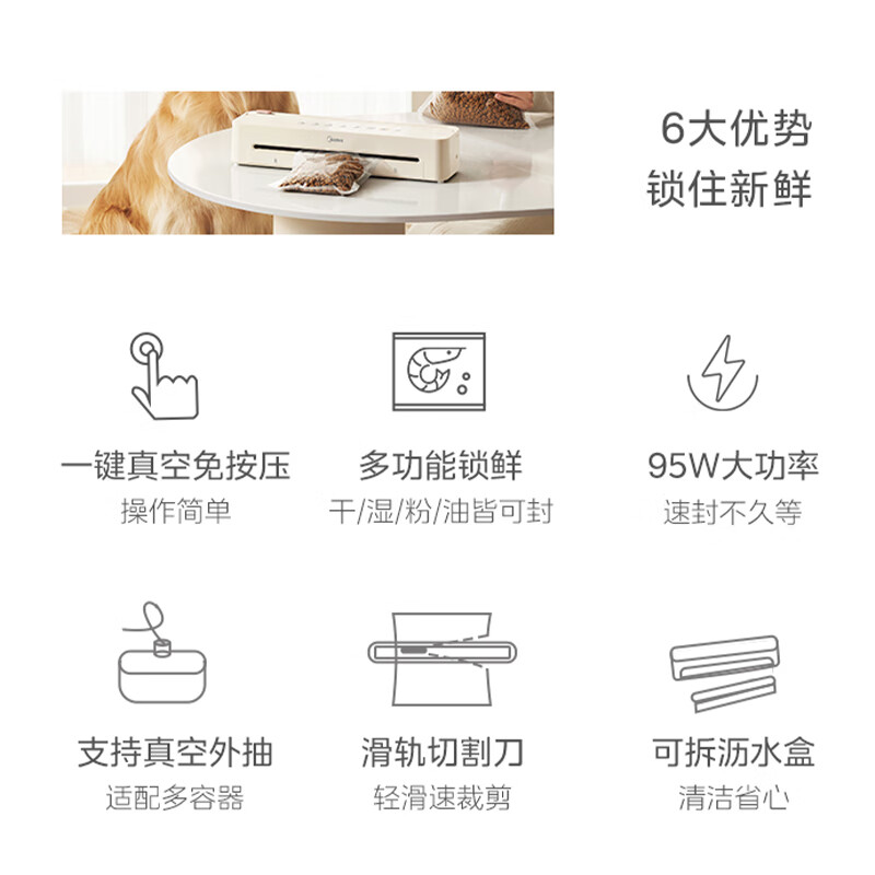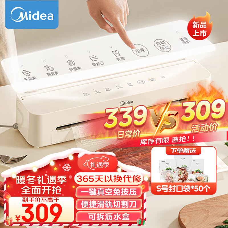 美的(Midea)真空包装机抽真空封口机家用小型干湿两用真空保鲜机食品塑封机密封机MJ-KF51价格:309.00元!