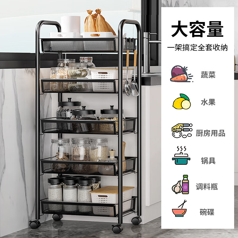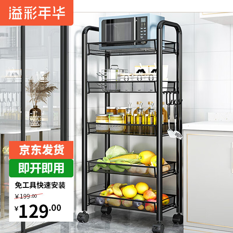 4、溢彩年华厨房置物架落地储物架移动收纳小推车蔬菜架子多层零食架1056-BK。质量很好,买来当天就用上了,很方便,价格也便宜