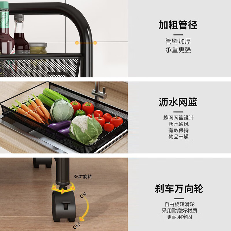 溢彩年华 厨房置物架落地可移动小推车蔬菜篮子收纳架客厅零食储物架1058价格:129.00元!