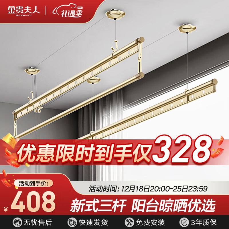 金贵夫人三杆升降晾衣架室内手摇晾衣杆阳台晒衣架晒被子 2米+10个衣架价格:458.00元!