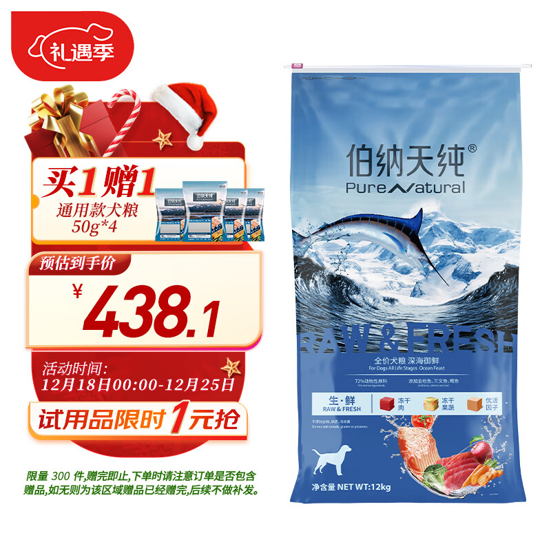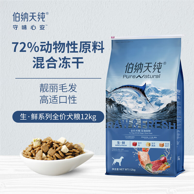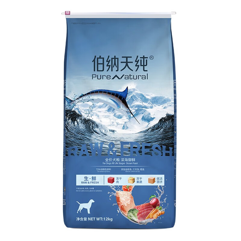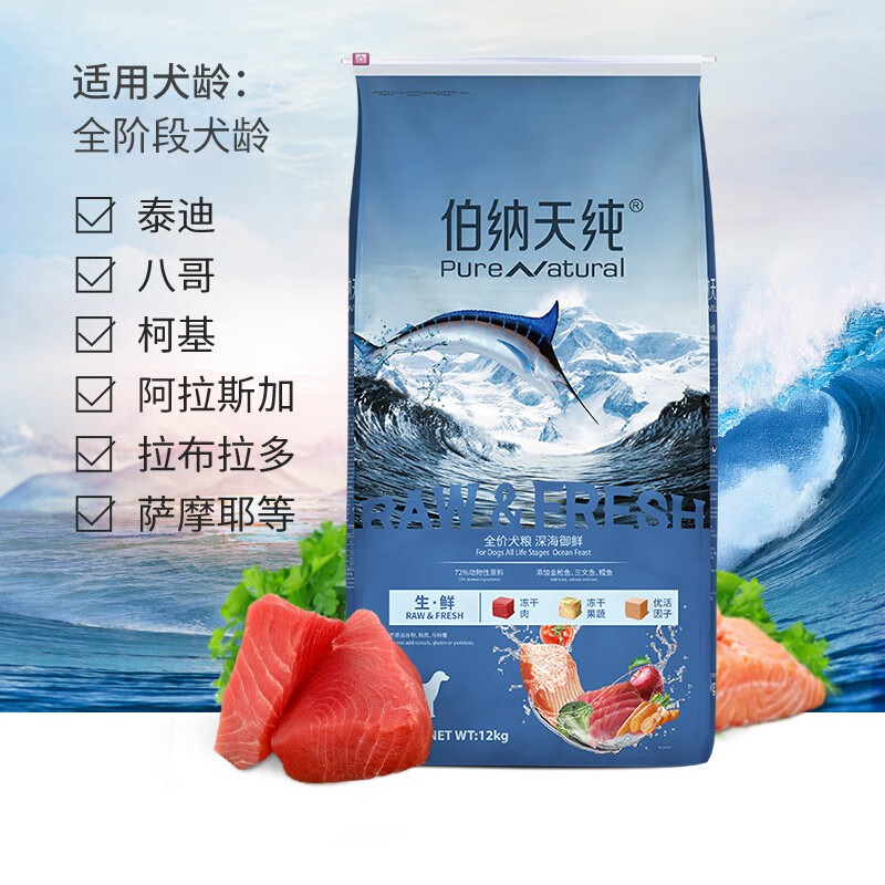 伯纳天纯狗粮三种鱼 成幼通用冻干犬粮深海御鲜(金枪鱼+鳕鱼+三文鱼)12kg价格:517.90元!