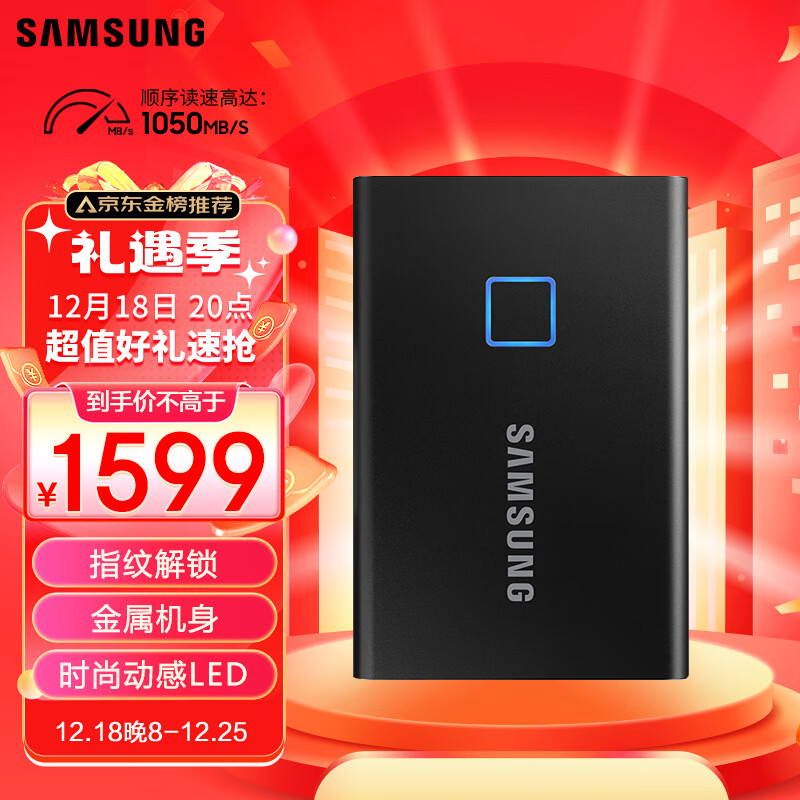 三星(SAMSUNG) 2TB Type-c USB 3.2 移动固态硬盘(PSSD) T7 Touch 黑色 NVMe传输速度1050MB/s 指纹识别价格:1599.00元!