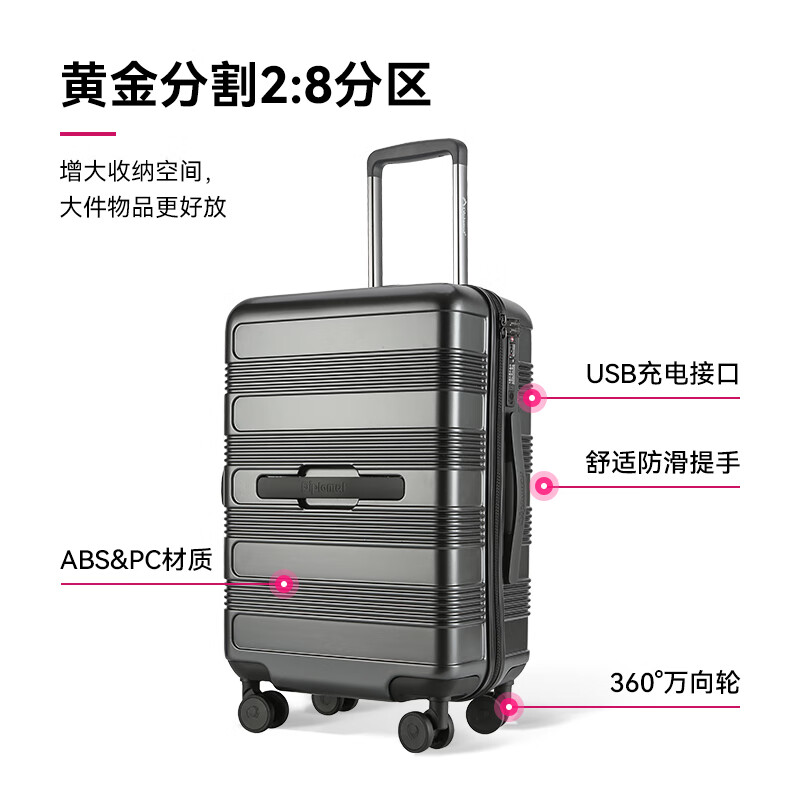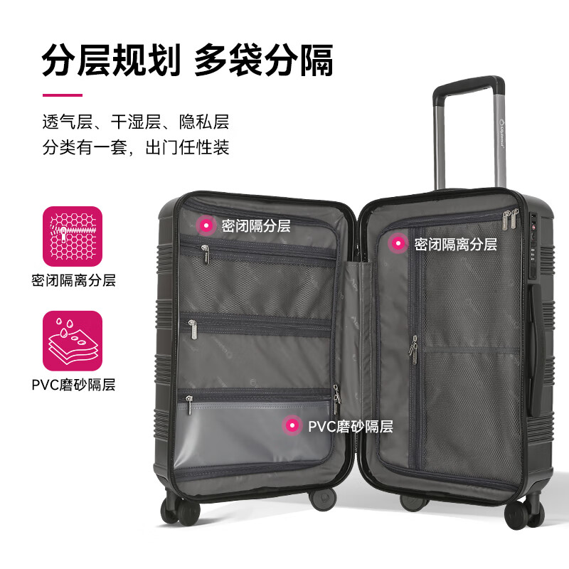 1、箱子颜值很高!超酷!轮子非常顺滑,转动灵活。箱子内有多种分隔,很实用。