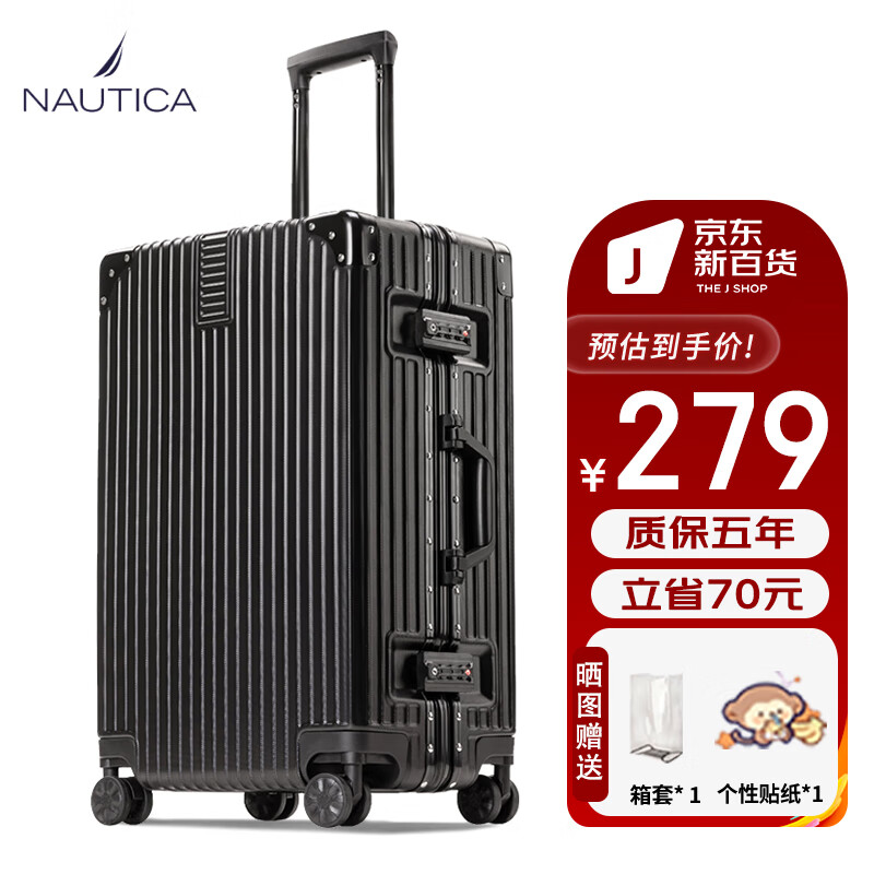 NAUTICA铝框行李箱男万向轮结实拉杆箱28英寸大容量女旅行箱黑色密码皮箱价格:349.00元!