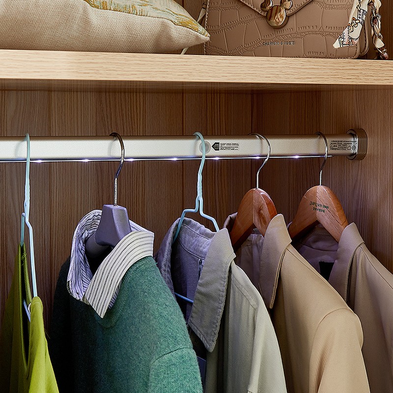 4、衣柜看起来还是不错的。基本没有啥味道,质量比较好,颜色也是想要的。安装师傅很利落,两个人一会就安装上了,使用上没啥问题。衣杆还是带灯带的,很好,是个亮点。
