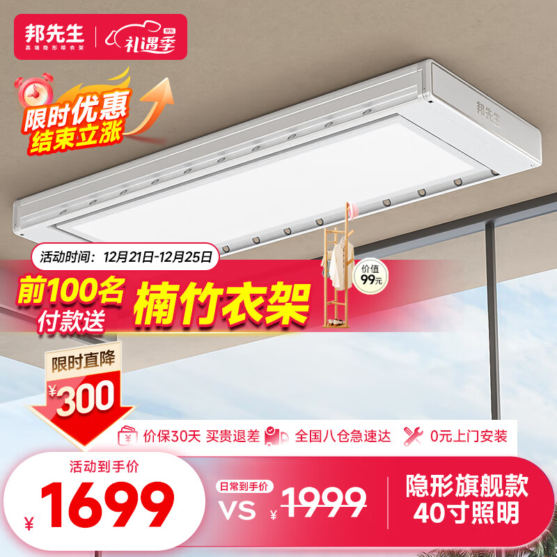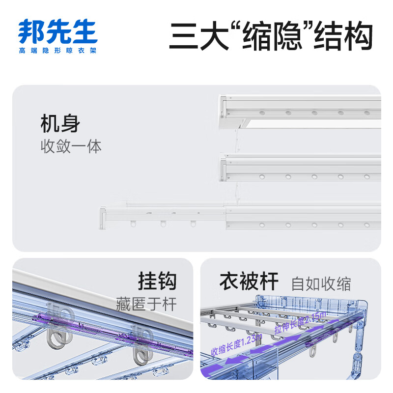 邦先生电动晾衣架智能阳台全自动升降超薄隐形伸缩嵌入式晒衣杆机M33白价格:1999.00元!