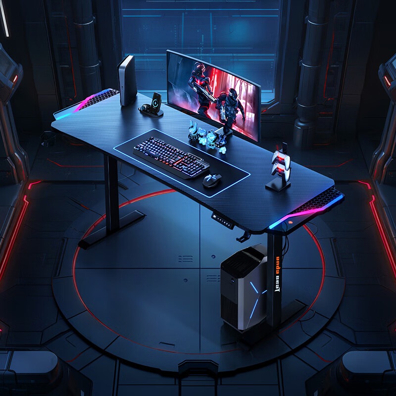 2、性价比超高的一款电竞桌,桌子面板是两块拼接的,接缝处很平整,无任何不适感,升降机感觉舒适,上升下降速度适宜,升降噪音很低,操作便捷!还送了全桌鼠标垫,完美契合!总体评价满意!