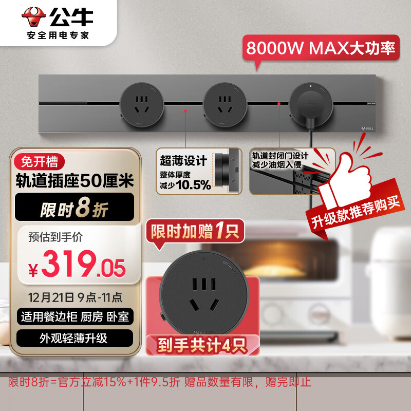公牛(BULL)明装 轨道插座 大师轻薄款可移动墙壁插座壁挂式滑轨插座 免打孔 50厘米轨道+3个五孔 钛金灰价格:399.00元!