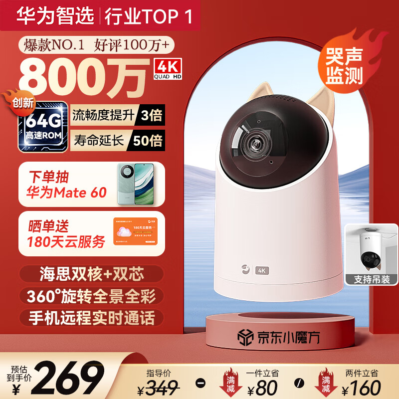 华为智选 海雀4K 800万监控摄像头手机远程监控器家用360度无死角带夜视全景 内置免插卡隐私高清室内摄像头价格:349.00元!
