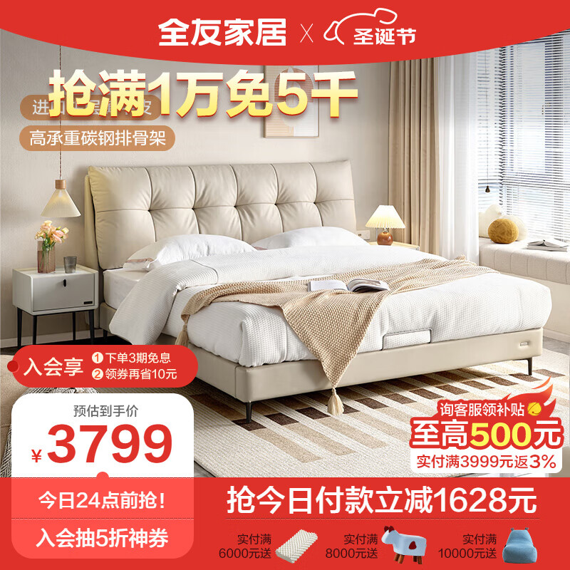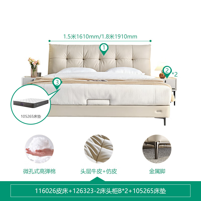 全友家居 真皮床舒适拉点靠包皮艺床双人床1.5米卧室床睡眠家具116026价格:5427.00元!
