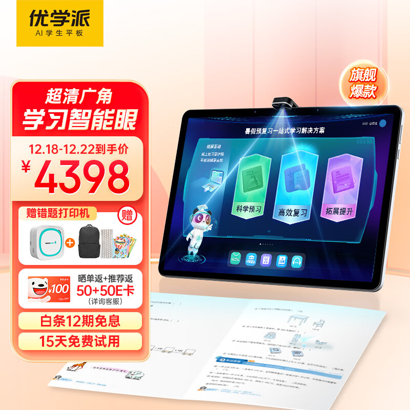 优学派AI学习机【年度新机】P30 8+256G 12.2英寸 大屏全局护眼平板电脑小初高学生英语学习点读机价格:4398.00元!
