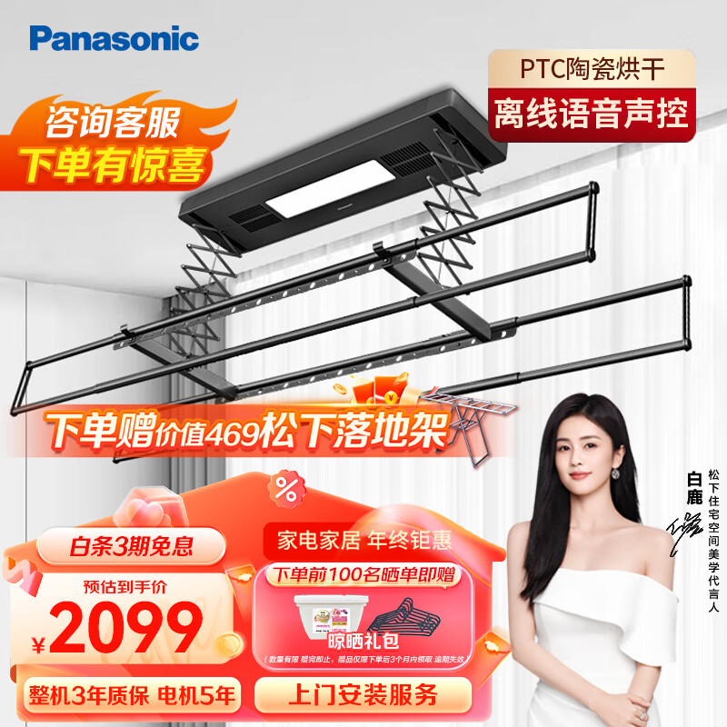 松下(Panasonic)电动智能烘干风干语音超薄嵌入式隐形藏晾衣架LED照明声控晒杆机价格:2199.00元!