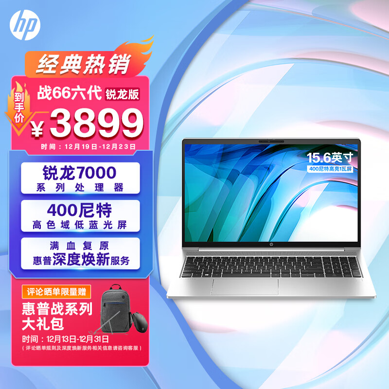 惠普(HP)战66六代 锐龙版15.6英寸轻薄笔记本电脑(2023锐龙R5-7530U 16G 1TB 长续航 高色域低蓝光屏 AI新体验高性能)价格:3899.00元!