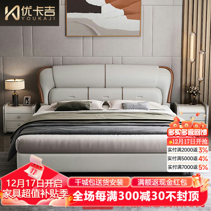优卡吉床双人床皮艺科技布艺轻奢主卧现代床LP-203# 1.8米气压床+床垫价格:2459.00元!