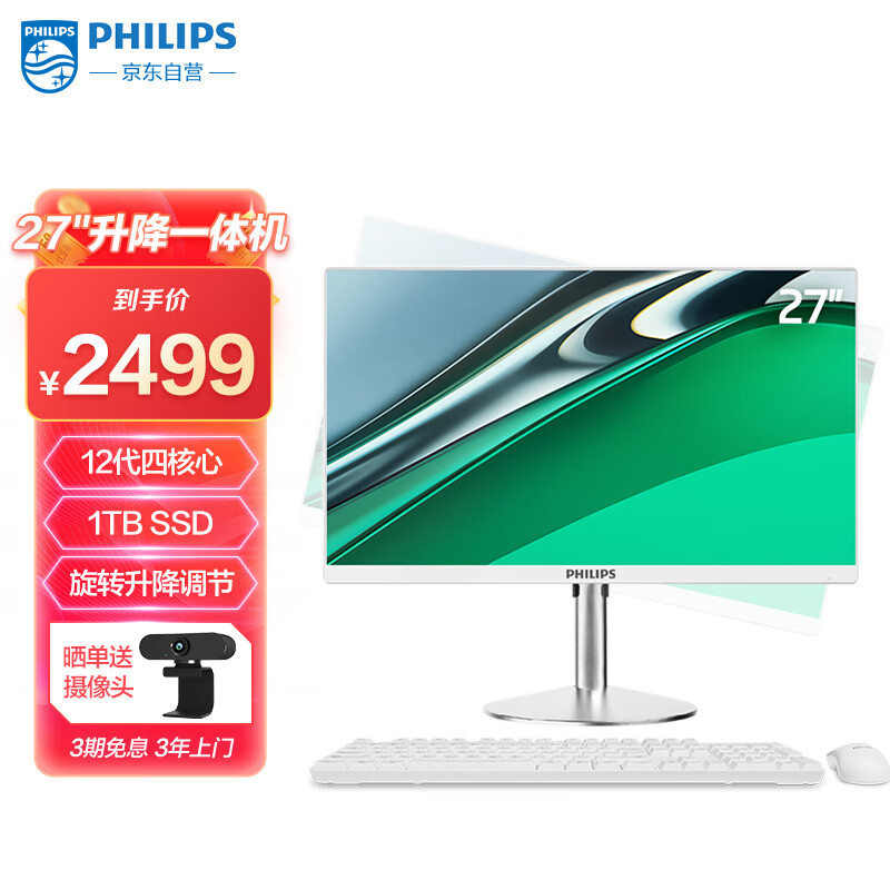 飞利浦S9 27英寸台式一体机电脑 家用学习办公收银主机(12代4核N95 16G 1TB SSD 双频WIFI 键鼠)白色价格:2499.00元!