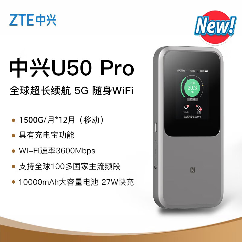 中兴5G随身WiFi6/10000毫安移动插卡cpe/载波聚合/NFC直连/U50 Pro【移动5G套餐卡 每月1500G一年】价格:2648.00元!